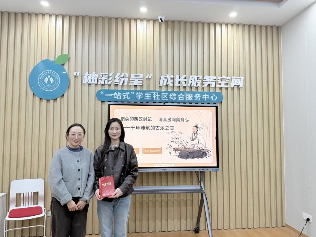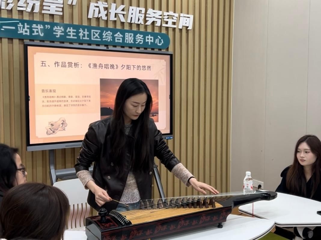 在沛筑演奏环节,马老师手把手指导学生入门技巧,详细拆解演奏要点,并演奏经典曲目《渔舟唱晚》。竹尺轻击琴弦,颤音婉转、刮奏流畅,让现场学生感受到古乐演奏的独特魅力。