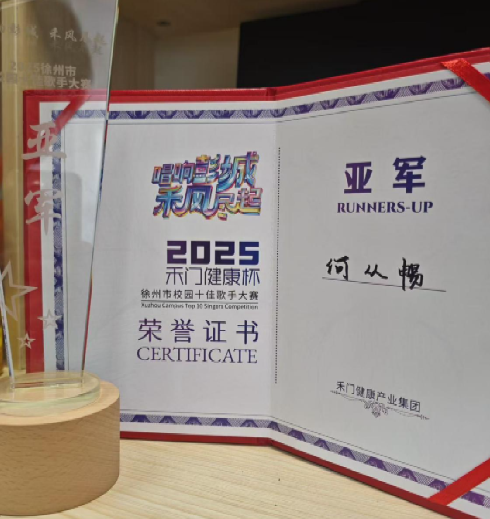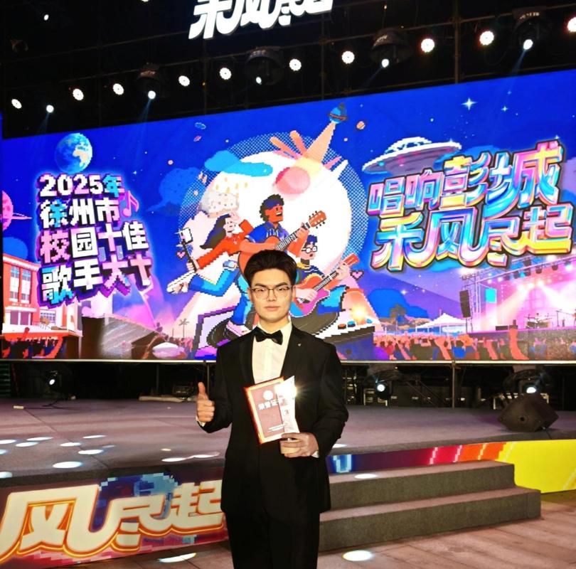11月09日,由共青团徐州市委员会、徐州市文化体育和旅游局联合主办的《唱响珠山,禾风尽起》——2025年徐州市首届大学校园十佳歌手大赛在泉山区珠山艺术街区圆满落幕。经过初赛、复赛、决赛三轮激烈角逐,我院2023级音乐表演专业何从畅同学凭借出色的演唱实力与亮眼的舞台表现脱颖而出,斩获大赛亚军(总成绩第二名)。